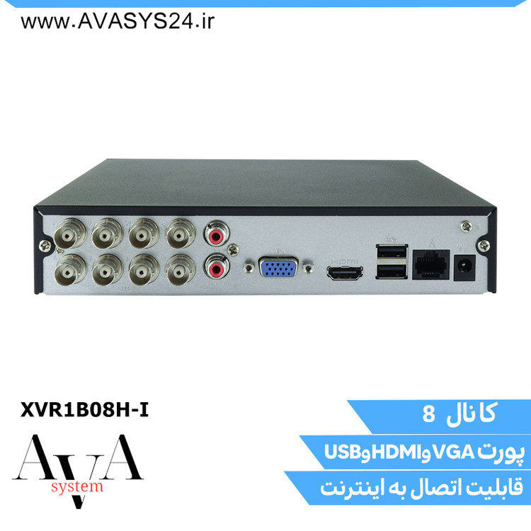 دستگاه DH-XVR1B08H-I دارای 8 پورت ورودی تصویر (BNC) و 1 عدد ورودی و 1 عدد خروجی صدا (AV)- دو عدد پورت USB – خروجی تصویر انالوگ (BNC) – خروجی تصویر HDMI و VGA فول اچ دی نیز میباشد .