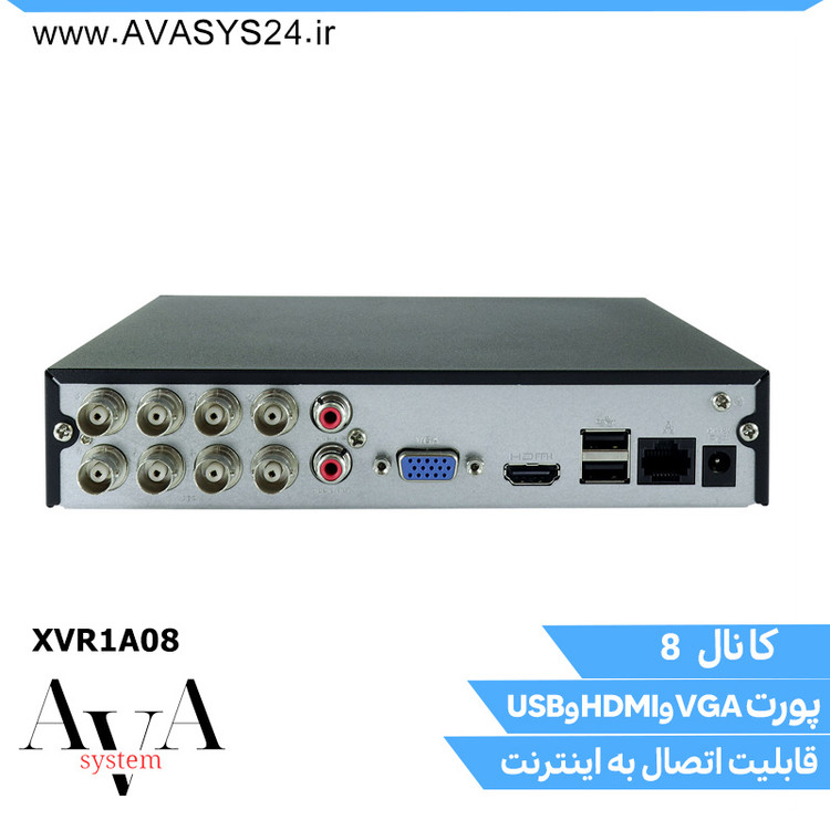 دستگاه داهوا مدل XVR1A08 دارای 8 پورت ورودی تصویر از نوع BNC و یک پورت ورودی و خروجی صدا از نوع AV می باشد.همچنین این دستگاه شامل 2 عدد پورت USB ، یک عدد پورت ورودی فیش اداپتور جهت تامین برق دستگاه ، 1 عدد پورت شبکه (LAN) و 2 عدد پورت خروجی تصویر از نوع HDMI و VGA می باشد.